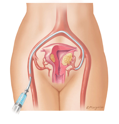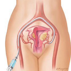 La embolización requiere de una incisión muy pequeña, aproximadamente del tamaño de un lunar, que se hace en la parte superior del muslo. Un pequeño catéter se inserta a través de esta incisión dentro de la arteria femoral. Con el uso de rayos X como guía, un médico capacitado identifica la arteria uterina en ambos lados del útero. Estas arterias suministran sangre a las fibromas en la mayoría de los pacientes que sufren de fibromas uterinas. Luego, el médico inyecta pequeñas partículas, del tamaño de un grano de arena, en las arterias uterinas para bloquear el suministro de sangre hacia el útero, provocando que los fibromas se reduzcan.